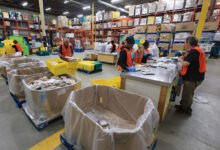 Volunteers work at the Calgary Food Bank on August 26, 2025. The food bank will…