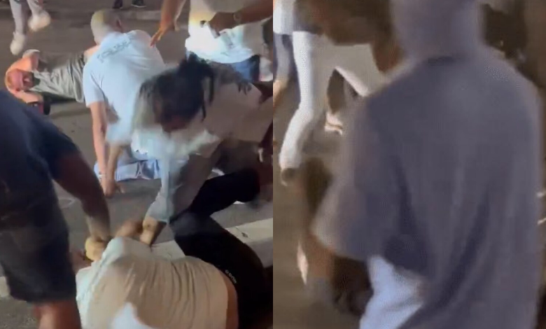 Footage of the fight quickly circulated on social media beginning Saturday morning. One video shows a man being repeatedly punched and kicked by multiple people. Another clip shows a woman falling to the ground after being violently struck, her head hitting the pavement. She appears to remain motionless afterward.