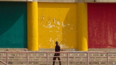 A man walks in front of a wall painted in the colours of the Malian flag, in Bamako [File: Rebecca…